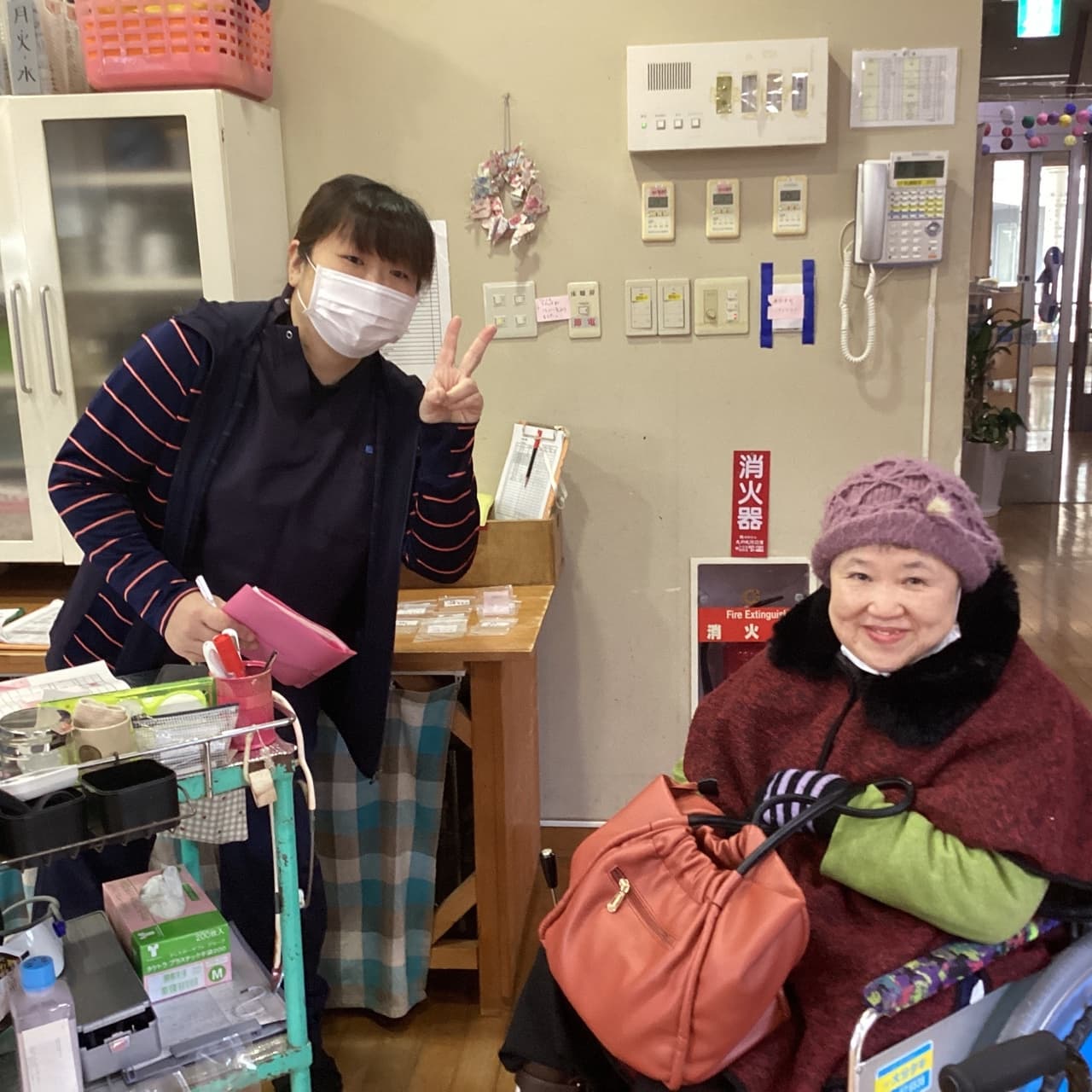 9:30までにデイサービスに到着します。笑顔でお出迎え、元気に挨拶。看護師が検温・血圧測定をして健康チェックを行います。また、利用者の皆様がそろいましたら朝のあいさつを行い1日の流れをお話をします。さぁデイサービスのスタートです!